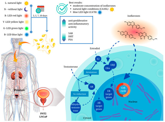 We have demonstrated for the first time that chickpea sprouts may play an important role in the chemoprevention of prostate disorders (Figure 5). However, attention should be paid to the isoflavone content in the sprouts, as chickpea sprouts with a moderate concentration of the compounds, harvested in natural light conditions (CA10L) and blue LED light (CA7B), showed the best scores in terms of their potential towards prostate disorders. Apart from significant antiproliferative activity, of great importance in BPH prophylaxis, these sprouts were also characterized by the significant inhibitory impact on other markers of prostate disorders, namely 5AR, DHT, and PSA, not only in testosterone-stimulated normal prostate epithelial cells but also in androgen-dependent prostate cancer cells. Importantly, CA7B and CA10L sprouts also revealed anti-inflammatory potential. Additionally, in our previous study, we showed the significant cytotoxic activity of CA10L sprouts on androgen-insensitive DU145 prostate cancer cells, making these sprouts important for further studies on other aspects of prostate disorders.