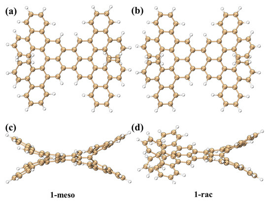Structure diagram of 1-meso (a); structure diagram of 1-rac (b); structural side view of 1-meso (c); structural side view of 1-rac (d).