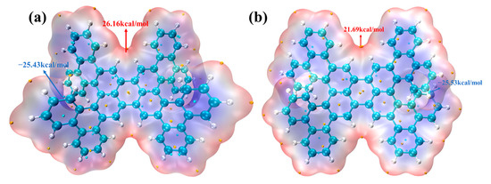 ESP isosurface diagram of 1-meso (a) and 1-rac (b).