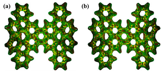 If the electrons in a molecular system have strong delocalization, a significant induced ring current will be generated when a magnetic field is applied. Therefore, we studied the induced currents of 1-meso and 1-rac induced by an external magnetic field, which is perpendicular to the molecular plane from inside to outside, as shown in Figure 6, Figures S4 and S5 (in the Supplementary Materials). The induced currents of 1-meso and 1-rac are clearly circular, and the red circular arrow indicates the direction of the system’s circular current. It can be seen from the figure that the current isosurface in the yellow region is mainly distributed on the inner side of the benzene ring. The ring current in each benzene ring is clockwise, and a clockwise ring current is also formed at the edge of the molecule. This indicates that 1-meso and 1-rac have strong electron dissociation.