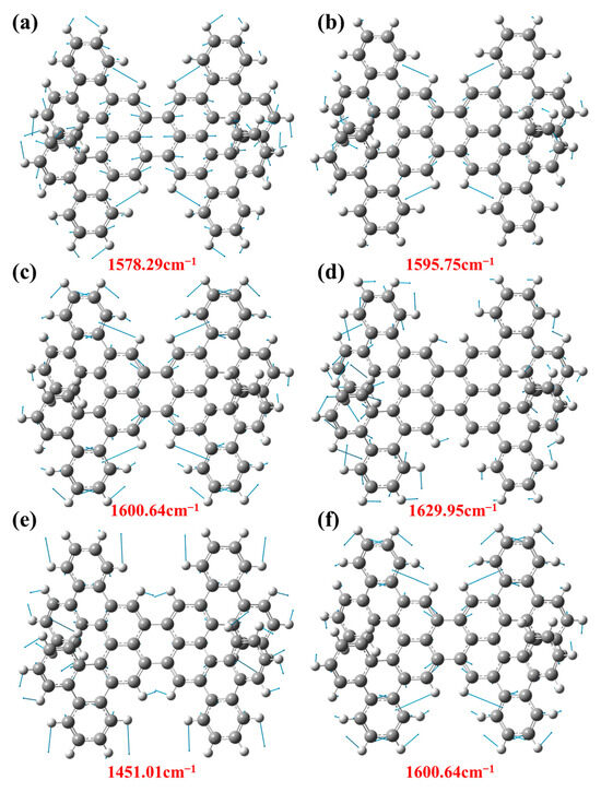 Then, the vibration attribution of 1-meso and 1-rac Raman characteristic peaks are analyzed and explained, respectively. With different frequencies, the vibration modes of the molecule are also different. In the vibration mode diagram, the direction of the vector arrow indicates the main direction of the atomic vibration, and the length of the arrow indicates the intensity of the vibration, which is the energy involved in the vibration. Figure 8 shows the vibration modes corresponding to 1-meso in different bands. The vibration mode at 1578.29 cm−1 corresponds with the contraction of the central benzene ring and the vibration of the surrounding hydrogen atoms. On the contrary, the vibration mode at 1595.75 cm−1 represents the lateral vibration of hydrogen atoms, as shown in Figure 8a,b. Figure 8c,d depict the vibration modes observed at the prominent peak position of 1-meso in the 325 nm resonance Raman spectra, where the vibration mode at 1600.64 cm−1 signifies the vibration of hydrogen atoms and the stretching vibration of the carbon atoms in the benzene ring. Additionally, the vibration mode at 1629.95 cm−1 indicates the lateral oscillation of H atoms. Figure 8e,f display the vibration modes of 1-meso at the position of the prominent peak in the 532 nm resonance Raman spectra. The corresponding vibration patterns at the higher peaks are attributed to the vibration of the H atoms. Notably, the vibration mode at 1600.64 cm−1 corresponds to the same position under 325 nm laser irradiation.