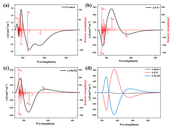 represents the TEDM and represents the TMDM. Here, the first term in the absolute value is light absorption and the second term is circular dichroism. The dominant ECD spectra are the tensor products of the TEDM and TMDM. Figure 10a shows the ECD spectra of 1-meso, while Figure 10b,c present the ECD spectra of two enantiomers of 1-rac. Figure 10d is their combined diagram. It can be observed from the figure that the chirality of 1-meso is weak, the chirality of the two enantiomers of 1-rac are strong, and the images of 1-(P, P) and 1-(M, M) are symmetric and have opposite Cotton effects.