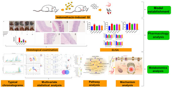 Non-steroidal anti-inflammatory drugs (NSAIDs) are the second-largest class of drugs after anti-infective drugs due to their analgesic and anti-inflammatory effects, especially in improving the inflammatory symptoms of rheumatic diseases [1,2]. The frequent use of NSAIDs can cause numerous adverse reactions, including gastric erosions, ulceration, and bleeding [3,4]. In addition, NSAIDs are the second most common etiological factor that destroys the integrity of gastric mucosa after Helicobacter pylori infection [5]. The pathophysiological processes that lead to NSAID-induced peptic ulceration are multifactorial and complex. Over the past few decades, several studies have shown that NSAIDs trigger gastric damage by directly impairing the integrity of the stomach mucosa, inhibiting COX-1, reducing the synthesis of prostaglandin, and generating reactive oxygen species [2]. The reactive oxygen species activate inflammatory processes in damaged gastrointestinal tissue [6]. The current prevention strategies for NSAID-associated gastropathy are not very effective [7]. Proton pump inhibitors (PPIs) such as lansoprazole and omeprazole usually require the concomitant administration of H2 blockers or prostaglandin to be more effective [8]. Moreover, although PPIs are effective against gastric injury (GI) to a certain extent, their clinical application is often limited because of side effects [9]. However, there is evidence to suggest that the co-administration of PPIs and NSAIDs may exacerbate intestinal injury and increase the risk of gastric cancer [10,11]. Therefore, complementary and alternative medicine in the GI induced by NSAIDs deserves more attention. Medicinal plant products have been used as possible therapeutic alternatives for gastro-protection over the past few decades and have been the subject of active scientific investigations [12].