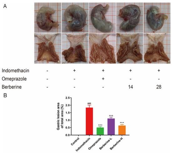 Effect of berberine on (A) the appearance of the indomethacin-induced GI in rats and (B) the percentage of gastric mucosal lesion area. n = 6; ### p < 0.001 vs. control group; *** p < 0.001 vs. indomethacin group.