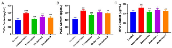 Effect of berberine on the expression of the proinflammatory cytokines in the serum of indomethacin-induced GI in rats. (A–C) The levels of TNF-α, PGE2, and MPO in rats’ serum. n = 6; ### p < 0.001 vs. control group; * p < 0.05, ** p < 0.01, and *** p < 0.001 vs. indomethacin group.
