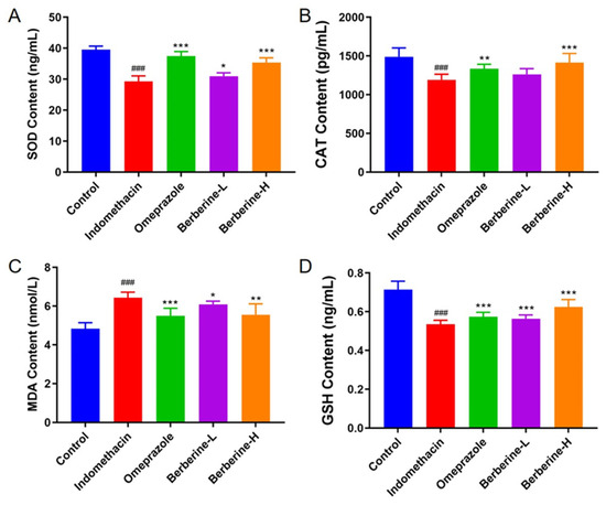 Effect of berberine on antioxidant biomarkers in the serum of indomethacin-induced GI in rats. (A–D) The activities/levels of SOD, CAT, GSH, and MDA in rats’ serum. n = 6; ### p < 0.001 vs. control group; * p < 0.05, ** p < 0.01, and *** p < 0.001 vs. indomethacin group.