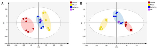 PCA score plot of the control, model, and berberine groups. (A): ESI+ model; (B): ESI− model.