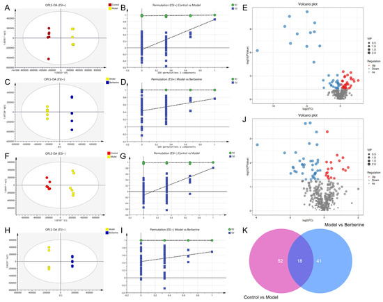 OPLS-DA analysis and potential biomarker exploration of berberine in the treatment of indomethacin-induced GI. (A) OPLS-DA score plot of control vs model group in ESI+ mode; (B) The 100-permutation test of the OPLS-DA model in ESI+ mode, control vs model group; (C) OPLS-DA score plot of model vs berberine group in ESI+ mode; (D) The 100-permutation test of the OPLS-DA model in ESI+ mode, model vs berberine group; (E) Volcano plots of all serum metabolites detected in ESI+ mode; (F) OPLS-DA score plot of control vs model group in ESI− mode; (G) The 100-permutation test of the OPLS-DA model in ESI− mode, control vs model group; (H) OPLS-DA score plot of model vs berberine group in ESI− mode; (I) The 100-permutation test of the OPLS-DA model in ESI− mode, model vs berberine group; (J) Volcano plots of all serum metabolites detected in ESI− mode; (K) Venn diagram of differential metabolites in control vs model vs berberine group. Pink circle indicates the number of differential metabolites between the control group and the model group. Blue circle indicates the number of differential metabolites between the model group and the berberine group.