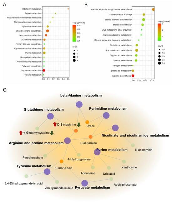 Then, MetaboAnalyst 4.0 was used to construct metabolic pathways for exploring berberine’s mechanism on indomethacin-induced GI, using identified potential metabolites. As shown in Figure 8A, 29 metabolic pathways (Table S4) were enriched in the model group compared with the control group, mainly involving the Tryptophan metabolism, Arachidonic acid metabolism, Primary bile acid biosynthesis, Pantothenate and CoA biosynthesis, and other pathways. As shown in Figure 8B, a total of 24 metabolic pathways (Table S5) were enriched in the GI rats with berberine administration, mainly in arginine biosynthesis, arachidonic acid metabolism, glutathione metabolism, and the citrate cycle (TCA cycle), etc. According to our observations, the model and berberine administration groups have 14 identical metabolic pathways, including arachidonic acid metabolism, butanoate metabolism, tryptophan metabolism, beta-alanine metabolism, steroid hormone biosynthesis, glutathione metabolism, biosynthesis of unsaturated fatty acids, arginine and proline metabolism, purine metabolism, pyrimidine metabolism, nicotinate and nicotinamide metabolism, pyruvate metabolism, cysteine and methionine metabolism, and Tyrosine metabolism. To further understand the metabolic biomarkers and enriched pathways, we mapped a comprehensive metabolic network diagram highlighting the critical interrelationships between pathways. Figure 8C displays this diagram in full detail.