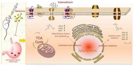 Our findings unequivocally demonstrate that berberine treatment efficiently mitigates gastric mucosal injury in rats afflicted with indomethacin-induced GI problems The present study utilized serum metabolomics to investigate the underlying mechanism of berberine against gastrointestinal issues. Remarkably, we identified 14 endogenous metabolites in serum that served as biomarkers to explicate berberine’s mechanism of action. This is the first study to report the identification of these biomarkers, which provide a novel insight into the effect of berberine on GI. Our research has uncovered 14 metabolic pathways of berberine that may be effective in treating GI in rats induced by indomethacin. The crucial mechanism of berberine in treating indomethacin-induced GI is shown in Figure 8C and Figure 9. Berberine has been shown to have a complex mechanism of action on the GI. This mechanism may involve the regulation of energy metabolism, oxidative stress, and inflammation. The implications of these findings are twofold. Firstly, they offer valuable insight into the treatment of GI issues induced by indomethacin, an NSAID drug. Secondly, they shed light on a possible mechanism of action of berberine for treating GI problems. According to the study, berberine can be a promising drug for treating GI disorders caused by NSAIDs. Moreover, the identification of metabolites and pathways can be potential drug targets for diagnosing and treating GI disorders. Further research is required to investigate the role of berberine in regulating endogenous metabolites associated with NSAID-induced GI issues. These findings may lead to the development of new therapeutic interventions for the prevention and management of NSAID-induced GI disorders.