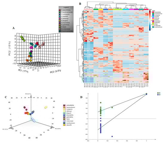 The PCA and heatmap clustering between Euodia species. (A) PCA analysis of all metabolites identified from Euodia species. (B) Heatmap clustering showing correlations among Euodia species samples based on global metabolic profiles. The color indicates the level of accumulation of each metabolite, from low (blue) to high (red). The Z−score represents the deviation from the median in standard deviation units. (C) PLS−DA analysis of all metabolites identified from Euodia species. (D) Permutations Plot for the PLS−DA model.