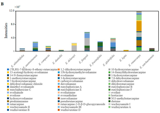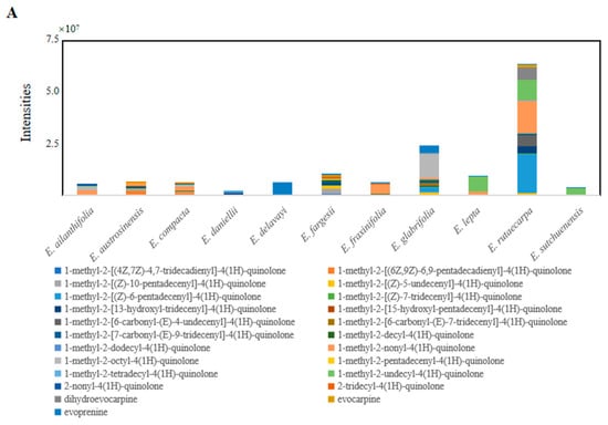 (A) Indole quinazoline alkaloids in putatively annotated metabolites from 11 species of Euodia; (B) indole quinazoline alkaloids in putatively annotated metabolites from 11 species of Euodia.