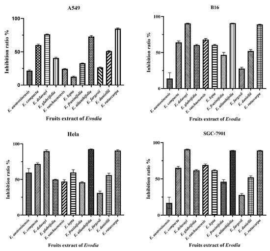 Subsequently, the functional analysis of the 11 species of Euodia was carried out to determine the anti-tumor properties of Euodia fruit in vitro. In the cell-based assays, the anti-tumor activity depended on the variety of Euodia. According to a study that separated Euodia plant compounds in the laboratory, it was concluded that the indole quinazoline alkaloids were mainly concentrated in the dichloromethane site [31]. Therefore, the anti-tumor experiments were carried out using the dichloromethane extract of Euodia fruits. According to the anti-tumor results, E. delavayi, E. ailanthifolia, and E. rutaecarpa had strong cytotoxic effects on the A549, B16, Hela, and SGC-7901 cell lines, and the inhibition rate exceeded 75% (Figure 4). The IC50 values of the three species are shown in Table 1. A cluster analysis of the putatively identified indole quinazoline alkaloids revealed that the evodiamine, rutaecarpine, and jatrorrhizine contents were the highest among the three species (Figure 5). According to previous studies, evodiamine and rutaecarpine have significant cytotoxicity against the A549 [32,33,34], Hela [35,36], B16 [37,38], and SGC-7901 [39,40,41] cell lines. Jatrorrhizine and its derivatives have great potential as anti-tumor compounds [42,43]. Therefore, we speculate that the anti-tumor activity of these three species may be due to the accumulation of evodiamine, rutaecarpine, and jatrorrhizine, which is basically consistent with the prescribed medicinal ingredients of E. rutaecarpa.