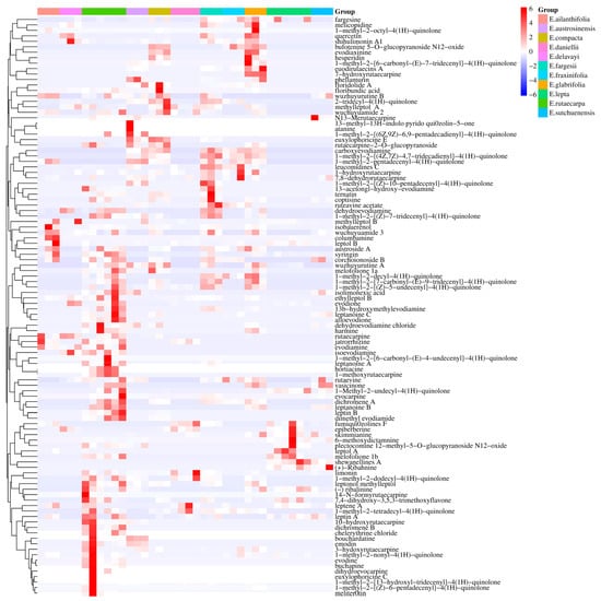 Cluster heat map of indole quinazoline alkaloids in 11 species of Euodia.