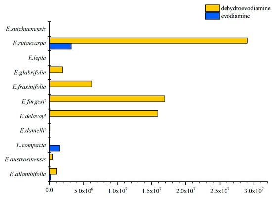 Between E. rutaecarpa and E. austrosinensis, differences in 49 metabolites were identified (21 upregulated and 29 downregulated). A similar trend was observed between E. rutaecarpa and E. compacta, for which differences in 62 metabolites were identified (30 upregulated and 27 downregulated). Differences in 60 metabolites were detected between E. rutaecarpa and E. fargesii (34 upregulated and 26 downregulated). E. rutaecarpa and E. glabrifolia had differences in 64 metabolites (36 upregulated and 29 downregulated). Differences in 50 metabolites were identified between E. rutaecarpa and E. ailanthifolia (15 upregulated and 34 downregulated). Similarly, differences in 35 metabolites (11 upregulated and 25 downregulated) were observed between E. rutaecarpa and E. daniellii. Differences in 21 metabolites were detected (3 upregulated and 18 downregulated) between E. rutaecarpa and E. delavayi. Between E. rutaecarpa and E. fraxinifolia, differences in 26 metabolites were detected (5 upregulated and 20 downregulated). Between E. rutaecarpa and E. lepta, differences in 65 metabolites were detected (28 upregulated and 38 downregulated). Finally, E. rutaecarpa and E. sutchuenensis had differences in 28 metabolites (6 up-regulated and 22 down-regulated).