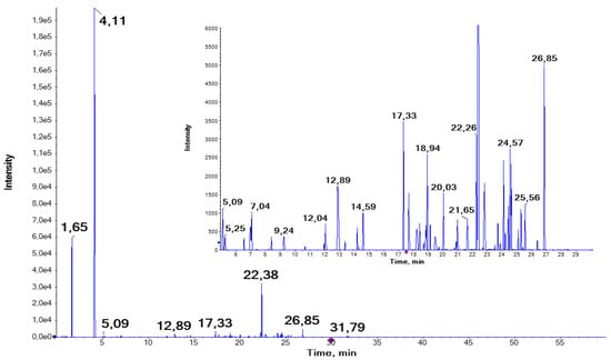 After the identification of vicine and convicine (compounds 1 and 2, Table 1), hereafter called the mother compounds, based on these characteristic fragment ions, and a comparison to published MS/MS spectra, it was observed that other compounds showed the same fragments. To extract potential (con)vicine derivatives, the data were filtered for the presence of the fragment at m/z 141.03 ± 0.015 (covering both vicine and convicine) using the PeakView fragment filter tool (version 2.2.0.11391, AB Sciex). The extracted fragment ion chromatogram generated is shown in Figure 1. A manual inspection of the MS/MS spectra, at which the fragment at 141.03 was observed, resulted in the identification of 163 features containing either vicine or convicine. The convicine-based compound m/z 720.322 at RT 27.08 is the derivative with the highest retention time. Compounds based on (con)vicine span the retention time range from 0.5 to 27.08 min and an m/z range from 303 to 1156.