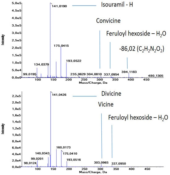At a retention time of 19.58 min, the m/z 141.03 fragment is observed in the MS/MS spectra of the compounds at m/z 480.124 (compound 38, Table 1) and 961.256 (dimer of 480.124). The exact m/z of 141.017 and 304.077 allows us to identify convicine, while the remainder of the highest fragment peaks (193.05, 175.04, 160.015, 134.036, and 132.02, Figure 2) agree with the MS/MS spectra of a ferulic acid standard and published data on ferulic acid conjugates [31]. Compound 38 is thus feruloyl convicine (calculated m/z 480.126; Figure 2, upper spectrum), one of the convicine derivatives previously identified [29]. The vicine homologue (compound 39; m/z 479.140; calculated m/z 479.142) was subsequently identified at a retention time of 19.95 min (Figure 2, lower spectrum). These identifications were confirmed in positive mode.