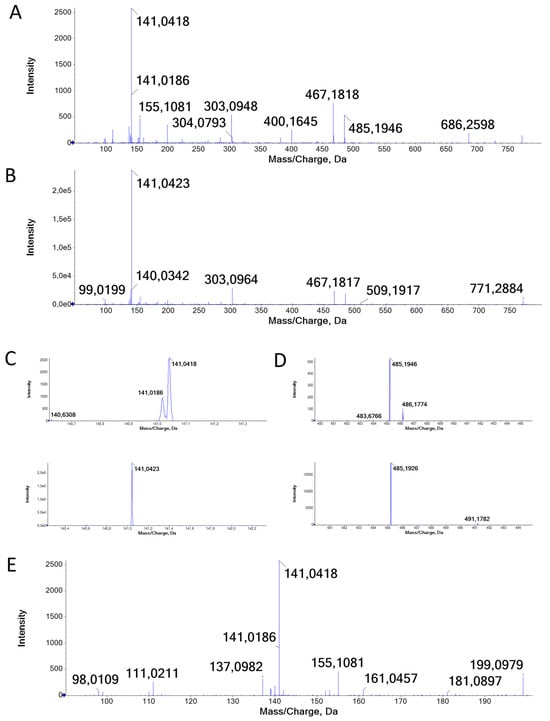 Details of these spectra confirm that compound 76 indeed contains both vicine and convicine. A detail of spectra Figure 4A shows that both 141.042 and 141.019, characteristic for vicine and convicine, respectively, are observed (Figure 4C, upper spectrum), while in the lower spectrum, a detail of Figure 4B, only the fragment indicating the presence of vicine is observed. Similar to this is the loss of both vicine and convicine, resulting in fragments at m/z 486.177 and 485.195 (Figure 4D upper spectrum), observed in the detail of Figure 4A. In the detail of spectrum 4B, only the loss of vicine to m/z 485.193 is observed (Figure 4D lower spectrum), confirming that compound 80 contains only vicine. Figure 4E shows the lower mass range of Figure 4A, illustrating that the same fragments that were used for the tentative identification of decenedioic acid as the derivatizing molecule of the compound 84 (Figure 3) are present. Taking all this into account, compound 86 is tentatively identified as a vicine linked to a convicine by decenedioic acid. Compound 80 is then two molecules of vicine linked by decenedioic acid.