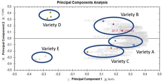 The 89 compounds represented in Table 1 were used for quantitative analysis. The principal component analysis with these compounds resulted in the separation of varieties D and E from the others on the first principal component, accounting for 58% of the variance (Figure 5). Varieties D and E are separated on the second principal component, accounting for 18% of the variance. Varieties A to C show a higher variance among the replicates and are less well separated on the PCA plot (Figure 5). Most of the compounds follow the profile of the mother compounds, that is, high in varieties A, B, and C and low varieties in D and E. For further quantitative assessment, more analyses are needed, as well as the use of standards for absolute quantification. However, the high MS signal intensities recorded for some of the derivatives reported here indicate that they are present in higher quantities than trace amounts.
