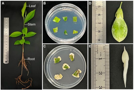 Morphological characteristics observation of Aquilaria sinensis. (A) Seedling; (B) leaf before callus induction; (C) leaf callus; (D) husk; (E) seed.