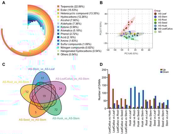 Analysis of volatile components in different tissue parts of Aquilaria sinensis. (A) The composition of volatile compounds in the class. (B) The principal component analysis (PCA) score plots of A. sinensis between six different tissue parts and quality control (QC) samples. (C) Venn diagram illustrating the distribution of various VOCs across different tissue components of A. sinensis. Each circle in the graph represents a comparison group. The numbers in the overlaps between the circles represent the number of common metabolites among the comparison groups. The number in the circle without any overlaps represents the number of distinct metabolites among the comparison groups. (D) Statistics of differential accumulation metabolites (DAMs) with different comparisons.