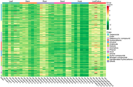 Additionally, the heatmap clearly depicted their classification into six distinct categories (Figure 3), thereby indicating variations in metabolite content across six different tissue sites. Among them, terpenoids, ketones, and other volatile metabolites generally accumulate at high levels in leaf callus. The accumulation of various metabolites in the husk was minimal. These findings suggest that there are variations in tissue metabolite accumulation patterns among different types of A. sinensis.