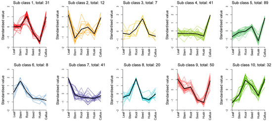 To identify the prevailing patterns in the distribution of differential metabolites across various tissue sites, we conducted K-means cluster analysis (Figure 4, Table S2). The findings revealed that these trends could be categorized into 10 distinct subclasses. Specifically, subclass 1 to subclass 10 encompassed clusters of 31, 12, 7, 41, 89, 8, 41, 20, and 50 metabolites, respectively. The most volatile components (89), primarily terpenoids, including 11 sesquiterpenes, were found in subclass 5. The data indicated that terpenoids were more commonly detected in leaf callus, followed by seeds, and less frequently observed in the husk. In addition, the predominant constituents in subclasses 1, 2, and 3 were esters, terpenoids, and esters, heterocyclic compounds, respectively. Hydrocarbons emerged as the major compounds in subclasses 4, 6, and 9. Esters dominated subclass 7, whereas terpenoids prevailed in subclasses 8 and 10. The accumulation of subclasses 1, 2, 4, 5, 9, and 10 was significantly observed in callus tissue. Subclass 3 exhibited significant accumulation in seeds. Subclass 6 showed significant accumulation in stems, while subclasses 1, 8, and 10 were found to accumulate significantly in roots. Leaves demonstrated a significant accumulation of subclasses 2, 7, and 9.