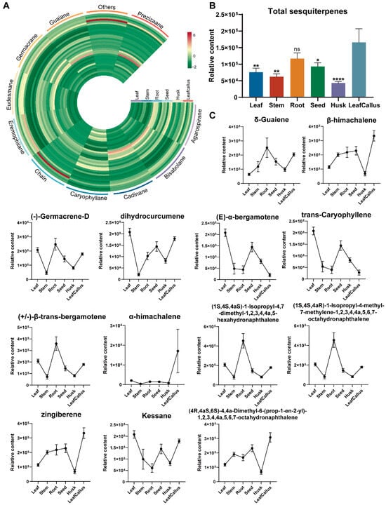 Analysis of sesquiterpenes in various tissue parts of A. sinensis. (A) Distribution of differentially accumulated sesquiterpenes. (B) The relative contents of total sesquiterpenes. ns, p > 0.05; *, p < 0.05; **, p < 0.01; ****, p < 0.0001, n = 6. (C) The relative contents of a subset of sesquiterpenes. Data are expressed as mean ± standard error of the mean (SEM); n = 6.