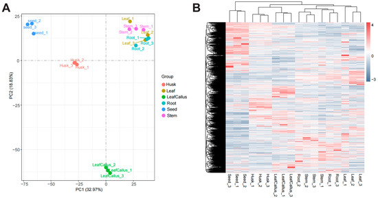 Analysis of differentially expressed genes. (A) PCA analysis of transcriptome data in different tissue parts of Aquilaria sinensis. (B) Heatmap based on hierarchical clustering analysis of differentially expressed genes (DEGs) in various tissue sites.