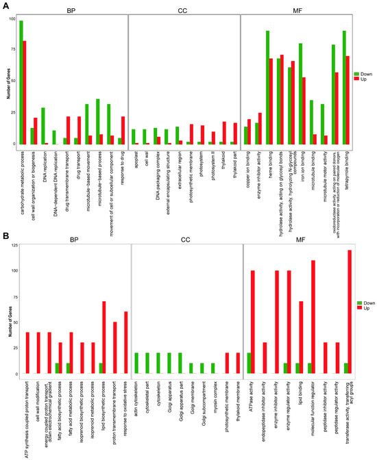 Analysis of differentially expressed genes. (A) Enriched GO terms of DEGs between husk and leaf callus. (B) Enriched GO terms of DEGs between stem and root.
