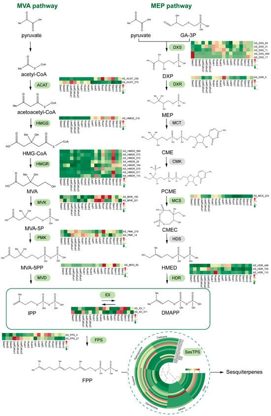 Schematic representation of DEG pathways involved in the sesquiterpene synthesis pathway. The color scale from green to red represents the expression level of DEGs from low to high. AACT: acetyl-CoA C-acetyltransferase; HMGS: 3-hydroxy-3-methylglutaryl CoA synthase; HMGR: 3-hydroxy-3-methylglutaryl coenzyme A reductase; MVK: mevalonate kinase; PMK: phosphomevalonate kinase; MVD: mevalonate diphosphate decarboxylase; DXS: 1-deoxy-D-xylulose 5-phosphate synthase; DXR: 1-deoxy-D-xylulose 5-phosphate reductoisomerase; MCT: mesaconate CoA-transferase; CMK: cytidylate kinase; MCS: 2-C-methyl-D-erythritol-2,4-cyclodiphosphate synthase; HDS: 4-hydroxy-3-methyl but-2-(E)-enyl diphosphate synthase; HDR: 4-hydroxy-3-methyl but-2-(E)-enyl diphosphate reductase; IDI: isopentenyl diphosphate isomerase; FPS: farnesyl-pyrophosphate synthetase; FPP: farnesyl pyrophosphate synthase; SesTPS: sesquiterpene synthase.