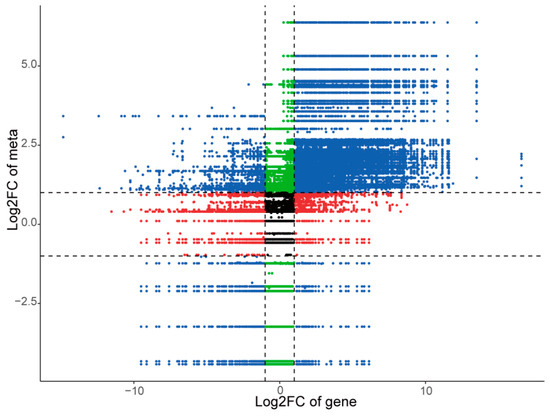 The Pearson correlation test was employed to investigate the association between differentially expressed genes (DEGs) and differentially abundant metabolites (DAMs) based on transcriptome and metabolome data. Only correlations with a Pearson correlation coefficient (PCC) value ≥ 0.7 and p ≤ 0.05 were considered significant. In R, DEGs and DAMs with a PCC ≥ 0.8 in each group were visualized using a nine-quadrant plot created with “ggplot2” and “getopt”. Additionally, DEGs and DAMs were mapped to the KEGG pathway database to obtain information about their shared pathways.