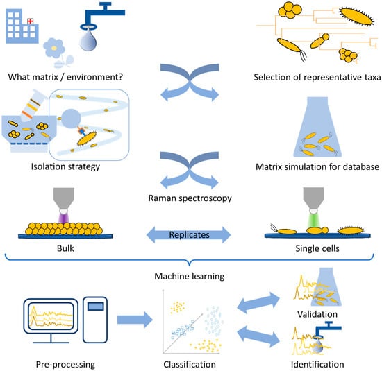 In this review, we demonstrate the workflow for establishing a reliable Raman database. As can be seen in Figure 1, the first question arising is always what microorganisms can be found in the chosen environment. For the database to be established, it is important to choose the representative taxa in such a way that a variety of strains/species/genera are included which can be found in the habitat under investigation. In addition, not only the key pathogen is important but also the bacterial species which naturally occupy this habitat. For establishing a database, a sufficient number of measurement repetitions should be performed. Here, the measurement strategy already defines the amount and variety of the bacterial strains under investigation. For bulk samples, the bacteria are cultivated prior to measurement. This allows for standardized conditions and can also lead to less complex datasets, since a pre-cultivation, e.g., on selective agar, might already preselect certain species of interest.
