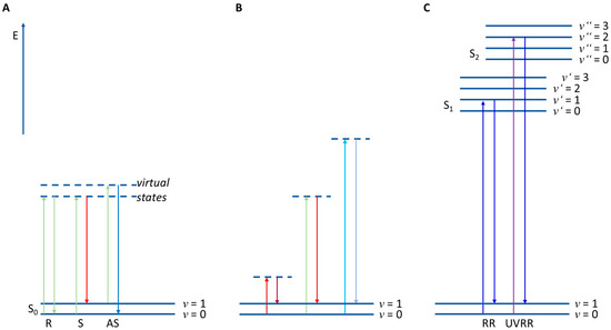 Figure 2. (A) Principle of Raman scattering: E—Energy; S0—electronic ground state; S1,2—first or second electronic excited state; v—vibrational eigenstates; R—Rayleigh scattering; S—Stokes–Raman scattering; AS—anti-Stokes–Raman scattering. (B) Stokes–Raman scattering with different excitation wavelengths. (C) RR—resonance Raman scattering; UVRR—UV resonance Raman scattering.