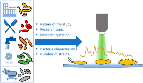 Bacteria show a high diversity at an intraspecies level [43], with strains of the same species being adapted to different environments, and having different lifestyles, food sources, and metabolic characteristics [44]. Thus, in microbiological Raman studies, the selection of the appropriate strains is one of the most important parts of the study design. When this step is not given the necessary attention, the study outcome can be significantly influenced, leading to poor-quality results that are prone to misinterpretation and unable to provide the desired read-out. The appropriate strain selection is mainly related to the nature of the study, the study topic, and the specific research question asked (Figure 3).