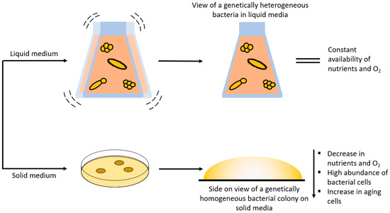 For Raman spectroscopic experiments, it is very important to decide whether the bacteria should be cultivated on solid media within Petri dishes [70,71,78,79] or in liquid media [72,79,80,81] within a flask. Both cultivation techniques have their respective advantages and disadvantages (Figure 4). It is more likely to find single bacterial colonies on solid media than in liquid media. These single colonies derive from one single replicating bacterium, which means that the colony itself is genetically homogeneous. In addition, a gradient containing several parameters (age, nutrients, CO2 and O2 levels, etc.) can be seen within single colonies [71]. These parameters can then be further influenced by the type of cultivation media, temperature, humidity, and so on within the incubator. Harz et al. cultured several Staphylococcus species under the suggested conditions (i.e., media and temperature) and under different conditions (e.g., 30 instead of 37 °C) to examine if the cultivation circumstances influenced the identification procedure in any way. Surprisingly, the different growth circumstances modified the bacteria; yet, using Raman spectroscopy with a support vector machine is an exceptionally competent approach for identifying single bacteria at different cultivation conditions, not only at the species level but also at the strain level [71].
