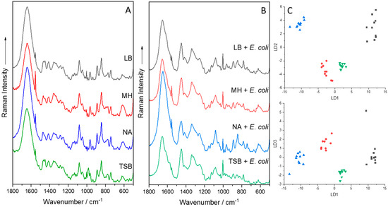 Figure 5. Mean Raman spectra of various agar, either pure (A) or with E. coli (B), measured with a Raman fiber probe at 785 nm. PCA-LDA plot of E. coli grown on various agar (C). Each dot represents one Raman spectrum. Black: Luria/Miller agar (LB); Red: Müller–Hinton agar (MH); Blue: Nutrient agar (NA); Green: Tryptic Soy Broth agar (TSB).