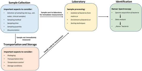 Figure 6. Integrated workflow for bacterial isolation: sample collection, transport and storage, processing, and Raman spectroscopy identification.