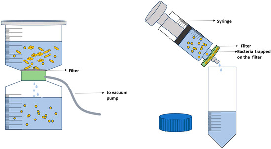 While filtration may be a commonly used method for isolation of bacteria, it has some drawbacks. As already highlighted, to ensure effective bacterial capture, the filter’s pore size must be sufficiently small, which can limit the types of filters and sample volumes that can be processed [209]. Additionally, microorganisms may adhere to the filter’s surface or become trapped within its pores, resulting in incomplete bacterial recovery [210]. As a result, filtration extracting bacteria from filters can be a complex undertaking.