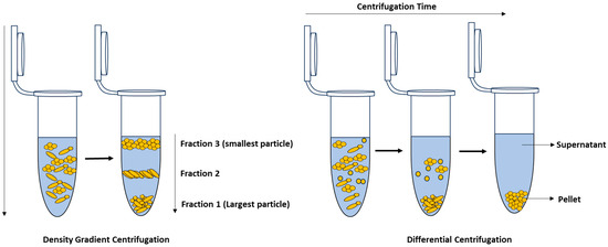 Centrifugation: Centrifugation is an isolation technique that separates particles or cells in a liquid medium by applying a rotational force around a fixed axis. This force propels particles or cells in a liquid medium to sediment, with the rate of sedimentation dependent upon a variety of physical parameters such as particle diameter, particle density, solution density, angle, and rotation speed [206]. Therefore, by modifying variables such as solution density and particle size, alternative centrifugation methods such as density gradient and differential centrifugation have been developed (Figure 8) [6].