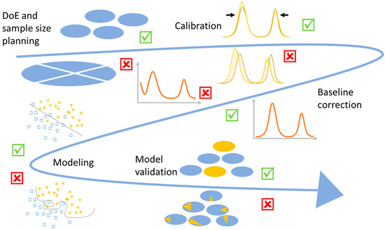 Finally, the last step of the study is the statistical evaluation. Here, calibration routines and pre-processing need to be established before a model database is trained. This model should, in the end, be challenged by independent validation data, and thereafter, it is desirable to use real-world samples for identification.