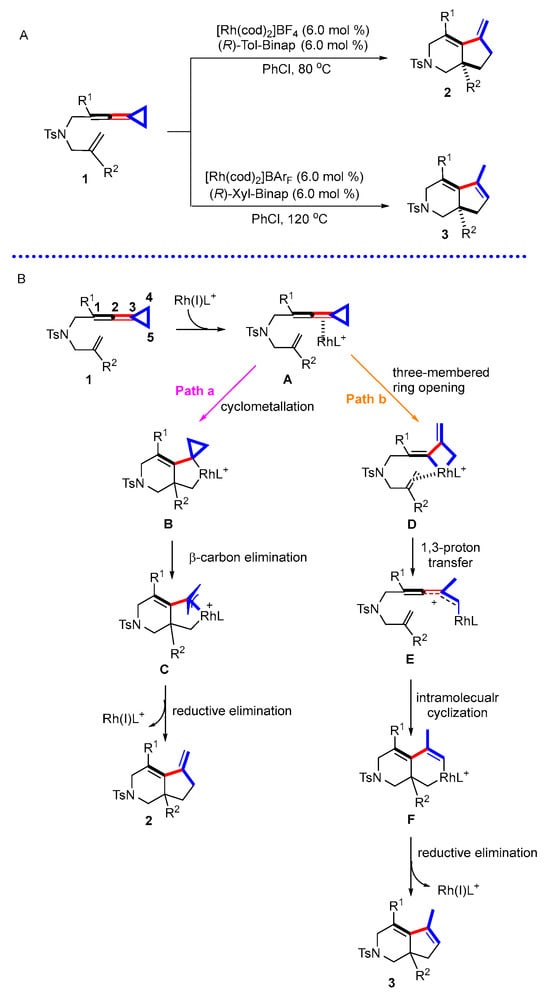 In 2019, our group reported Rh(I)-catalyzed stereoselective intramolecular cycloaddition reactions of ene-vinylidenecyclopropanes, constructing fused 6,5-bicyclic skeleton (Scheme 1A) [23]. Interestingly, when the substituent in the quaternary carbon center is a methyl group, the reaction shows exclusive temperature-controlled regioselectivity. When the temperature is 80 °C, a product with an endo double bond can be obtained, while when the temperature is 120 °C, a product with an exo double bond is obtained. Based on experimental results and previous studies, two possible reaction pathways were proposed in this paper (Scheme 1B). In pathway a, Rh first coordinates with the allene moiety C2-C3 double bond of VDCP to produce complex A, which undergoes cyclometallation to form a rhodacyclic intermediate B. The intermediate B undergoes β-carbon elimination to produce π-allyl rhodacyclic intermediate C, which then undergoes reductive elimination to render product 2; in pathway b, complex A alternatively produces intermediate D through cleavage of the C4–C5 bond at the distal end of the three-membered ring, which undergoes 1,3-proton transfer to obtain intermediate E and, after successive cyclometallation, to produce intermediate F and then to generate product 3 through a reductive elimination process.