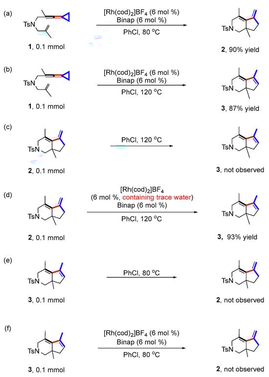 First, we repeated the control experiments from our previous report [24] (Scheme 3) (for detailed information, see page S12 in the Supporting Information). The same results were obtained as shown in the previous report. Under the standard reaction conditions, the reaction of substrate 1 took place smoothly, affording product 2 with 90% yield at 80 °C and product 3 with 87% yield at 120 °C, respectively (Scheme 3a,b); the exocyclic double bond product 2 could not be directly converted to endo double bond product 3 at 120 °C without the rhodium catalyst and ligand (Scheme 3c). Surprisingly, product 2 was converted to 3 with 93% yield at 120 °C with [Rh(cod)2]BF4 as the catalyst and Binap as the ligand, which was different to previous findings [24] (Scheme 3d). We speculated that the system may already contain trace amounts of water to assist in the formation of product 3. In addition, during the weighing of the rhodium catalyst, we found that the original red brown powder was very susceptible to moisture. Therefore, we measured the water content of our used rhodium catalyst via Karl Fischer coulometric titrations [31,32,33,34] and unsurprisingly found that the rhodium catalyst had a water content of 3.59% (for detailed information, see page S18 in the Supporting Information). Furthermore, the control experiments showed that 3 could not be converted to 2 at both 80 °C and under standard conditions (Scheme 3e,f).