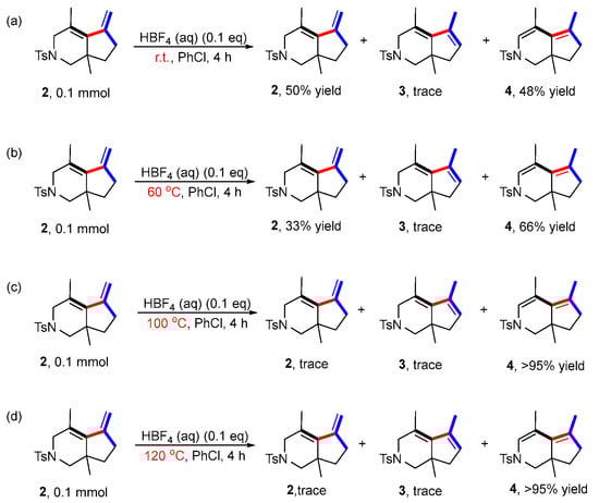 Four 10 mL dried tubes were charged with 2 (0.1 mmol, 1.0 equiv). The reaction tube was evacuated and backfilled with argon (repeated three times). Then, PhCl (1.0 mL) and 50% wt HBF4 (aqueous) (0.01 mmol, 0.1 equiv) were added into these tubes. The reaction mixture was stirred at room temperature, 60 °C, 100 °C and 120 °C for 4 h. After the reaction was completed, the reaction mixture was cooled to ambient temperature. The solvent was removed under reduced pressure, and the residue was purified using flash column chromatography (SiO2). The product was analyzed with 1H NMR spectroscopic data. At all temperatures, almost no product 3 was observed, and product 2 was gradually converted to product 4 as the temperature increased.