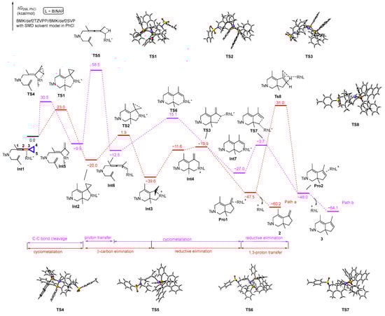 Transition-metal-catalyzed chemical transformations of vinylidenecyclopropanes (VDCPs), methylenecyclopropanes (MCPs), vinylcyclopropanes (VCPs) and other strained small ring compounds [1,2,3,4,5,6,7,8,9,10] with high tension have been frequently used in recent years to synthesize polycyclic skeletons, which have potential applications in the field of medicinal chemistry and materials [11,12,13,14,15]. Among them, rhodium catalysts play an important role in the field of catalytic cyclization. For example, in 2013, Cui’s group developed Rh(III)-catalyzed C–H activation/cycloaddition of benzamides and methylenecyclopropanes, constructing spiro dihydroisoquinolinones and furan-fused azepinones [16]. In 2017, Yu’s group developed a rhodium(I)-catalyzed intramolecular bridged [5 + 2] cycloaddition of cis-allene-VCPs to obtain bicyclo[4.3.1]decane skeleton [17]. In the same year, Evans’ group developed a rhodium-catalyzed ene-cycloisomerization of allylic-sulfide-containing alkenylidenecyclopropanes, which affords functionalized five-membered carbo- and heterocyclic rings with a transposed allylic sulfide [18]. In 2020, Wang’s group reported Rh(I)-catalyzed reaction of siloxyvinylcyclopropanes and diazoesters, which leads to the formation of siloxyvinylcyclobutane and 1,4-diene derivatives [19]. In these reactions, density functional theory (DFT) calculations were proved to be a powerful and effective tool for exploring the mechanistic insights of these rhodium-catalyzed reactions [20,21,22].
