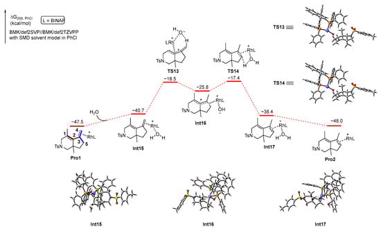 We can conclude from the above calculations that product 2 is accessible, but product 3 is difficult to obtain whether the proton transfer occurs in the step from Int5 to Int6 or the step from Pro1 to Pro2. Combined with the previous experimental results, we began to consider that the presence of trace water in the reaction system might have contributed to the formation of product 3. Subsequently, we found in our experiments that the rhodium catalyst we used readily absorbed water, and together with some previous studies [23], we began to explore whether water could assist in the proton transfer process of this reaction and the details of the role of water with DFT calculations. We first performed DFT calculations to investigate the water-assisted proton transfer process in Path b. The results of the calculations are shown in Scheme 7. In this process, water is involved in the reaction starting from Int5. First, a molecule of water is coordinated with the rhodium atom of Int5 to produce the intermediate Int11, which is a slightly endothermic process with 2.3 kcal/mol. Subsequently, a proton of water is transferred to the terminal carbon atom C4 of the exo double bond of the four-membered rhodium ring to generate the hydroxyl-rhodium intermediate Int12, passing through transition state TS11 with an activation barrier of 19.2 kcal/mol; afterward, a hydrogen atom at the carbon atom C5 is abstracted by the hydroxyl group to obtain the double-bonded four-membered ring tetrameric rhodium intermediate Int13, which is required to overwhelm an energy barrier with 20.0 kcal/mol via transition state TS12. The intermediate Int14 is generated when the water molecule on rhodium is released, which gives off 4.2 kcal/mol of energy; then, Int14 undergoes cyclometallation to obtain the intermediate Int7, which passes through transition state TS6 with an exothermic heat of 25.8 kcal/mol. Finally, Pro2 is produced by the reductive elimination of Int7 via transition state TS7 with 23.3 kcal/mol energy barrier.