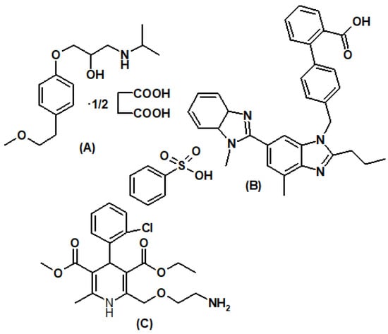 Chemical structure of metoprolol succinate (A), telmisartan (B), and amlodipine besylate (C).