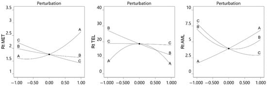 Perturbation plot for effect of pH of buffer (A), acetonitrile concentration of mobile phase (B), and flow rate (C) on retention time of MET, TEL, and AML.