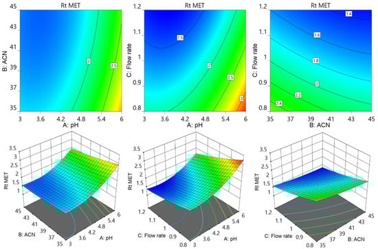 Contour and surface response models for showing effect of pH of buffer (A), acetonitrile percentage of mobile phase (B), and flow rate (C) on retention time of MET.