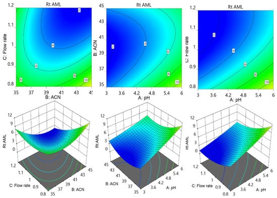 Contour and surface response models for showing effect of pH of buffer (A), acetonitrile concentration (B), and flow rate (C) on retention time of AML.